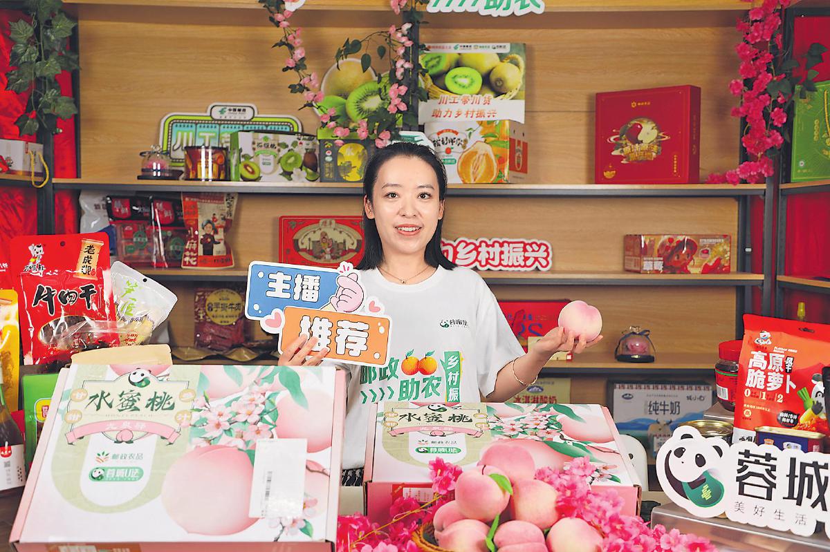 “龙泉水蜜桃汁水丰沛、口感香甜,每一口都像在品尝夏天!”6月20日,在龙泉驿区农业农村局与山泉镇政府联合主办的特色农产品展销活动中,邮政员工布展搭景,通过直播推销龙泉水蜜桃,引来果农的围观,同时也收获了大量网友的点赞与订单。自水蜜桃大量上市以来,成都邮政加大助销力度,频繁参与展销推介会,为龙泉水蜜桃倾情代言、直播带货。
