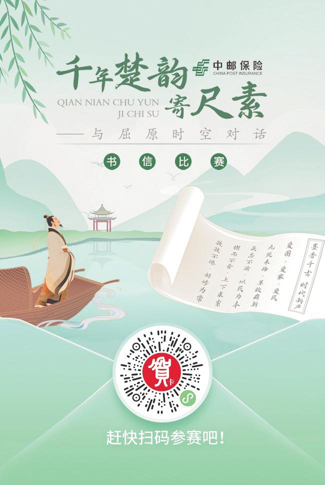 一纸方寸,千年楚魂。在《楚辞》特种邮票确定于5月31日首发后,湖北省邮政分公司提出以书信比赛为邮票发行引流造势、同步推动函件业务发展的设想。5月11日,由中邮保险冠名的“千年楚韵寄尺素——与屈原时空对话”书信比赛横空出世。此次比赛最大的亮点是参赛作品通过“寄贺卡”小程序线上征集,这也是中国邮政首次利用线上小程序开展的书信比赛活动。