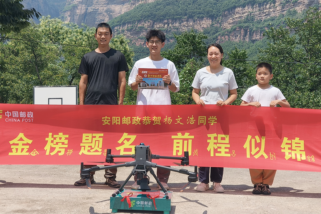 “今天是个好日子,心想的事儿都能成……”7月25日,随着由远及近的欢快音乐,一架无人机在安阳林州石板岩镇郭家庄村杨文浩家门前缓缓降落,机身上悬挂的红条幅在阳光下格外亮眼,条幅上“金榜题名”四个金字像一团跳跃的火焰,瞬间点燃了村口的热闹氛围。