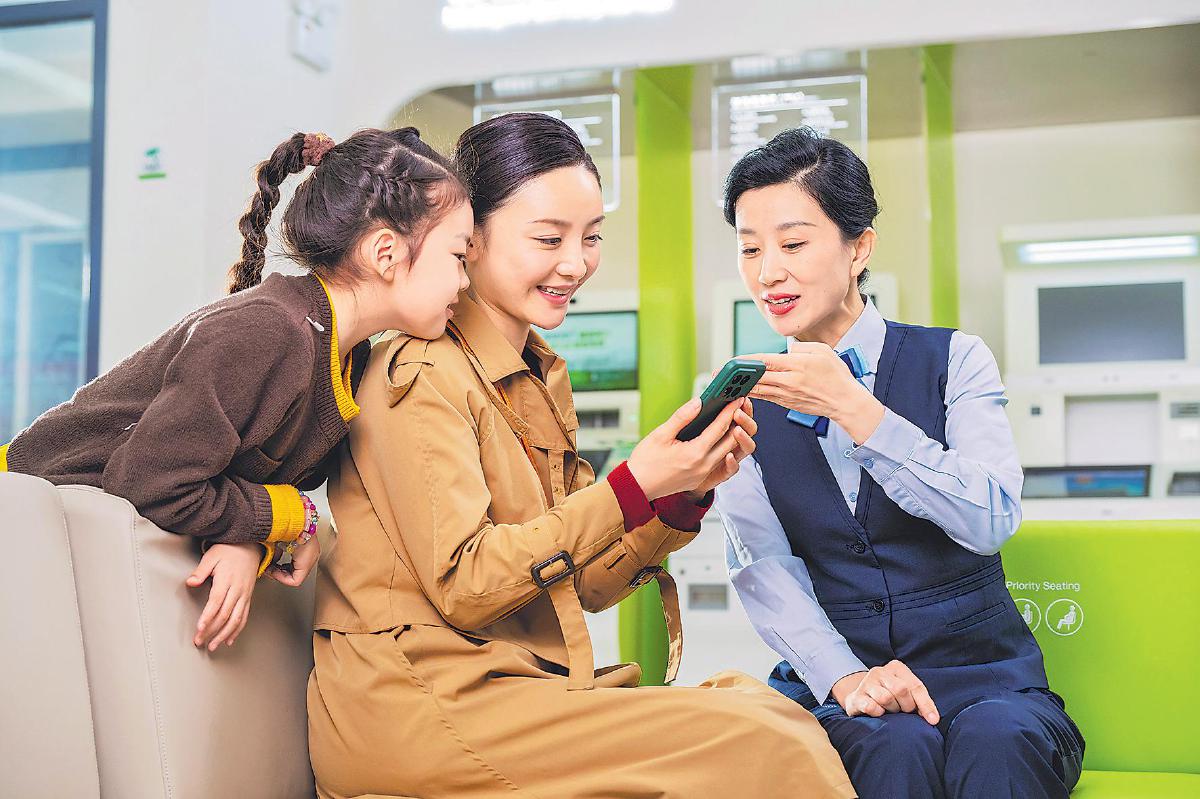 在邮储银行济南市历下支行,工作人员“一对一”为客户介绍手机银行新功能,助力客户享受智能化服务。