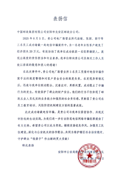 8月6日,安阳市公安局殷都分局刑事侦查大队发来表扬信,感谢电厂营业所协助警方成功抓获一名犯罪嫌疑人,并称赞该所邮政员工在反诈工作中主动担当、精准拦截,有效守护了群众财产安全。代淑敏、张颖和郭宁一致表示,防范电信诈骗、守护人民群众财产安全,是每一名邮政储蓄员工应尽的职责,在以后的工作中,将继续保持高度负责的态度,筑牢反诈防线。