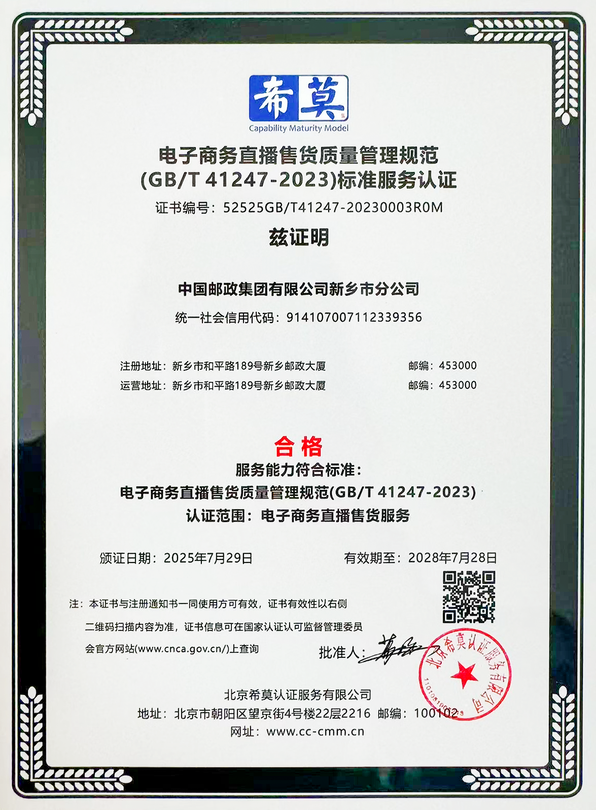近日,新乡市邮政分公司正式通过《电子商务直播售货质量管理规范》(GB/T 41247-2023 )国家标准服务认证,成为中国邮政首家通过电商直播售货质量管理的国标认证的合规机构。