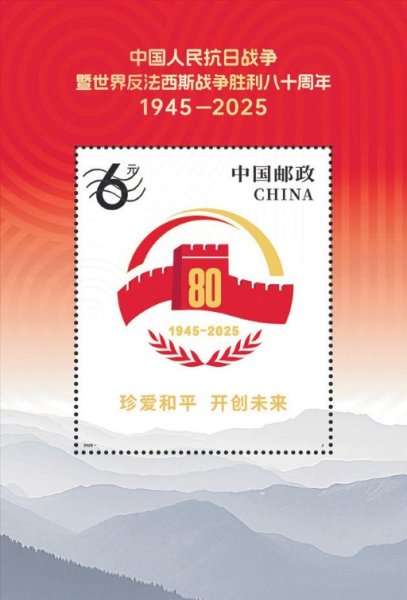 小型张使用中国人民抗日战争暨世界反法西斯战争胜利80周年纪念活动标识作为主景,主要表现“珍爱和平、开创未来”。