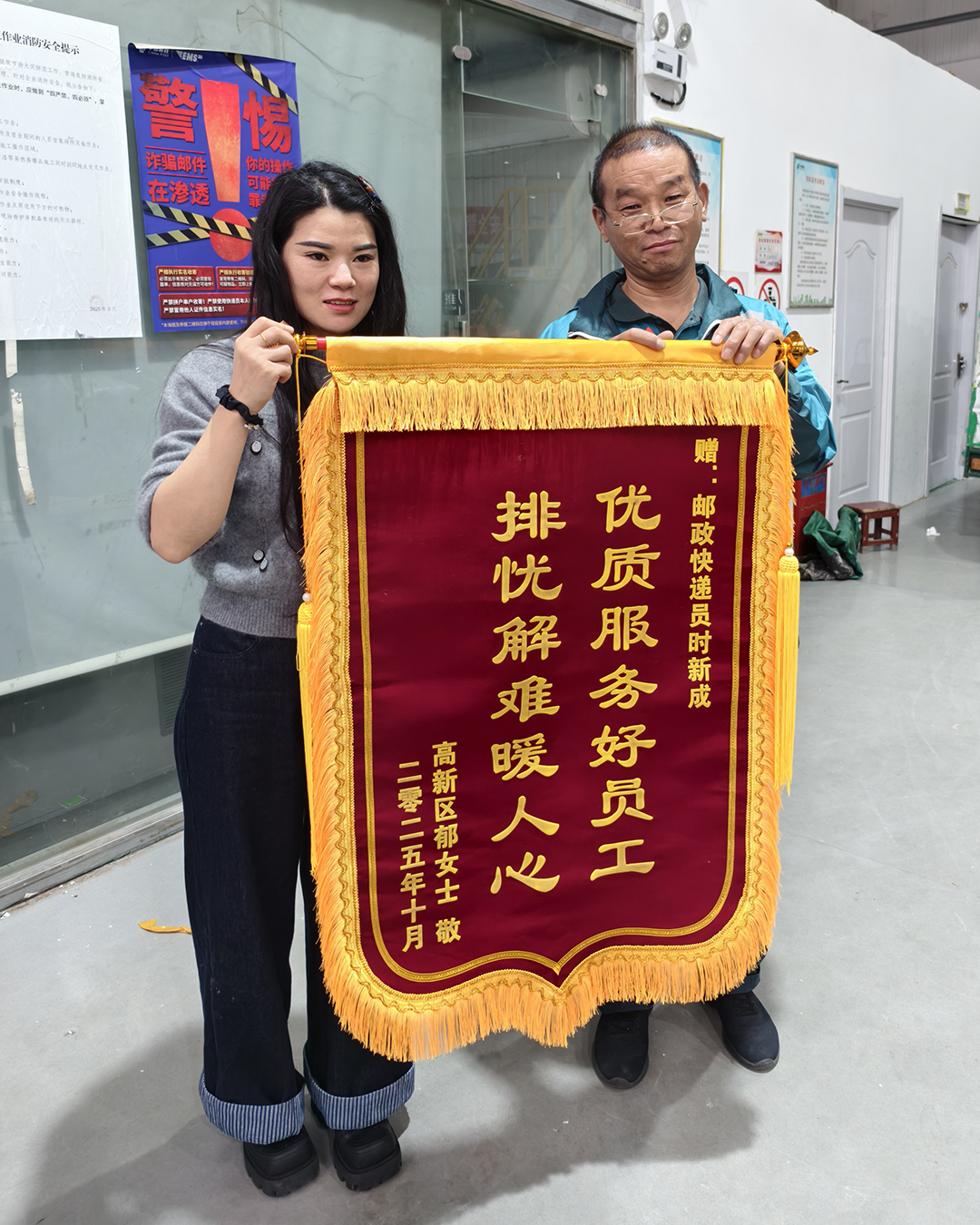 居民们朴实的话语,勾勒出一位敬业奉献的邮政投递员形象。20多年的投递生涯,时新成用脚步丈量责任,用汗水浇灌信任。10月15日,郁女士带着一面写有“优质服务好员工,排忧解难暖人心”的锦旗,专程来到冬青街揽投部,亲手交到了时新成的手里,再次向他表达谢意。