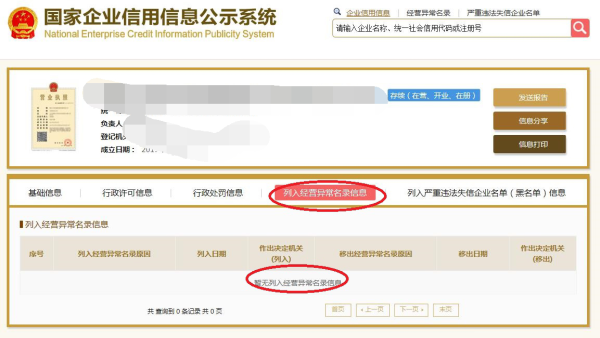 第4步:选择“列入经营异常名录信息”,截取当前页面,显示“暂无列入经营异常名录信息”,即可报名。