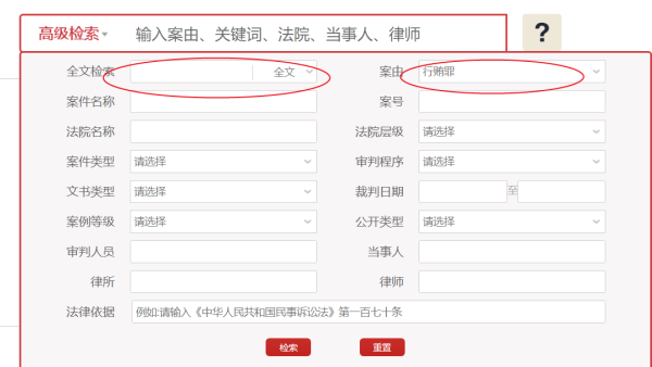 第2步:点击“高级检索”,选择“刑事案由”→“贪污贿赂”→“行贿”。